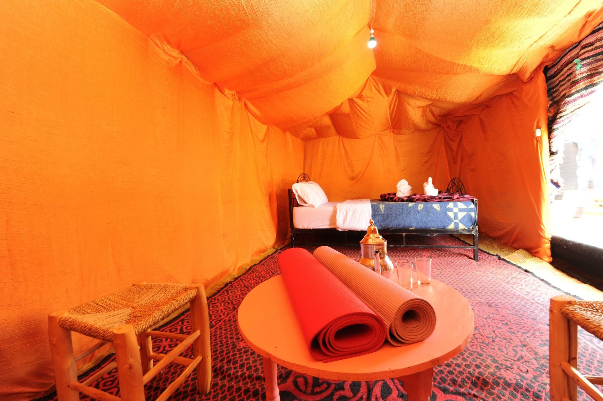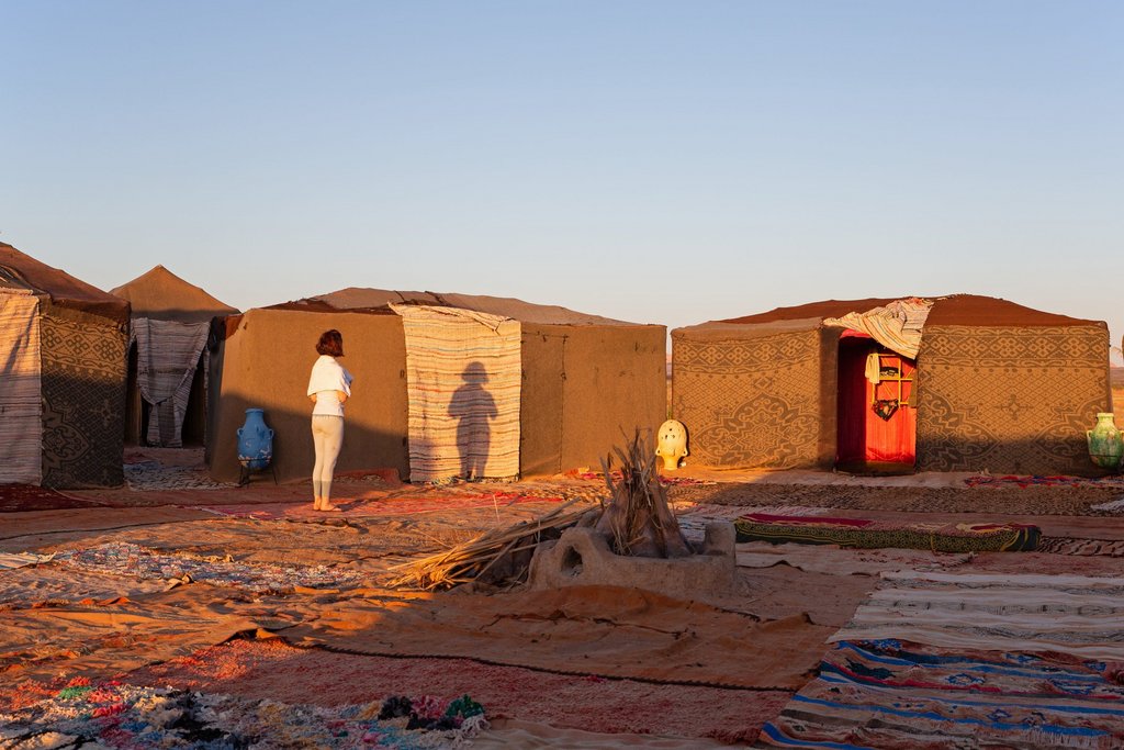 Die Zelte im Wüsten-Camp sind etwa 5x3 Meter groß, verfügen über ein massives Doppelbett oder Einzelbetten mit Matratze, Spannbettlaken, Kissen und Decken. Ein kleines Regal aus Bambus sowie ein kleiner Tisch stehen Ihnen zur Verfügung. In Merzouga werden Sie in einer landestypischen Unterkunft untergebracht, wo Ihnen ein eigenes Bad sowie Klimaanlage und Heizung zur Verfügung stehen. Das Zelt/ Zimmer kann auch zur Einzelnutzung gebucht werden.