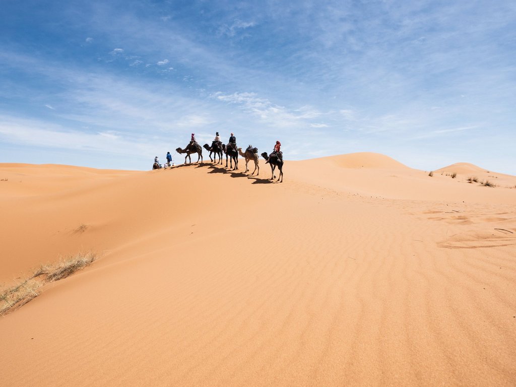 Nach dem morgendlichen Yoga in der Wüste kehren Sie mit den Kamelen zurück nach Merzouga. Im Dorf unternehmen Sie einen Rundgang durch die Oase. Von der Familie Oussidi werden Sie mit einem traditionellen Berberessen in ihrem Haus bewirtet. Im Anschluss an das Mittagessen besuchen Sie das Kinderhilfsprojekt, welches von Barak Oussidi gegründet wurde und eine Berberkooperative, die traditionelle Handwerkskunst anbietet.