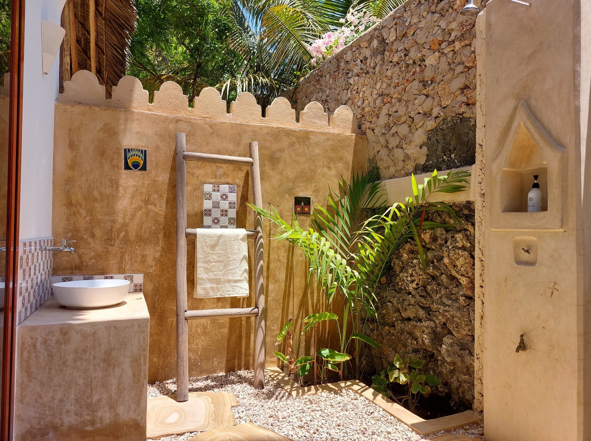 Beide Suiten verfügen über ein großes Doppelbett, ein einzelnes antikes Zanzibar-Bett, das als Tagesbett oder Sofa genutzt werden kann, einen Schreibtisch und einen Stuhl zum Arbeiten sowie ein Badezimmer aus Korallenstein. Sie sind mit einer Klimaanlage ausgestattet. Hier genießen Sie viel Privatsphäre mit einem separaten Sitzbereich im Garten. Beide Suiten verfügen über eine große Außenterrasse mit Blick auf den Indischen Ozean.