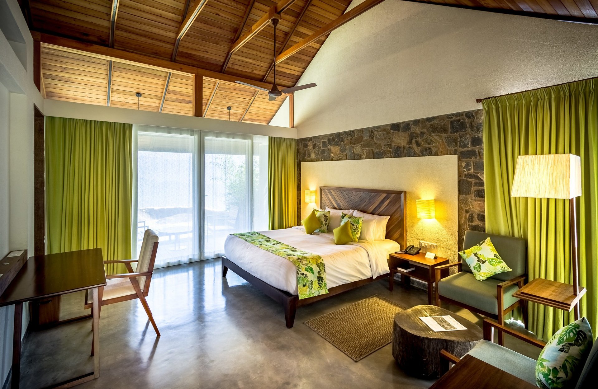 Die 9 geräumigen Zimmer mit Gartenblick sind sehr stilvoll gestaltet in einer eleganten Mischung aus Stein und Holz. Sie haben alle einen Balkon mit Blick in den schönen halbwilden Garten. Die Bäder sind sehr geschmackvoll in Stein und Holz gehalten und die Dusche gewährt den Blick in einen begrünten Lichthof. Es steht Kokokusnussöl und Zahlpulver aus dem eigenen Garten bereit.