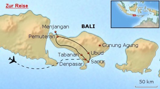 Die Anreise nach Bali erfolgt in der Regel mit einem Nachtflug ab Deutschland mit einem Zwischenstopp. Sie erreichen den internationalen Flughafen Ngurah Rai am Nachmittag oder frühen Abend des Folgetages. Von dort bringt Sie ein privater Transfer in etwa zwei Stunden nach Tabanan zu Ihrer ersten Unterkunft. Alle erforderlichen Transfers während der gesamten Reise sind im Reisepreis enthalten und werden im PKW durchgeführt. Flüge können auf Wunsch über NEUE WEGE ab Ihrem bevorzugten Flughafen hinzugebucht werden.