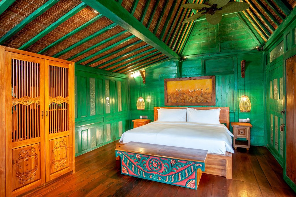 Die 11 Gladak Suiten sind schön gestaltete, einzeln stehende Bungalows umgeben von Reisfeldern. Mit 55m² bieten sie viel Platz. Für ein authentisches Wohnerlebnis ist die Gladak Suite die richtige Wahl. Diese Suiten sind Nachbildungen einer vintage Bauernresidenz, die aus den originalen Komponenten eines Gladak Hauses bestehen. Das verwendete Holz ist wiederaufbereitet. Von Ihrem Balkon aus können Sie die Bauern live beobachten. Das Badezimmer in der Gladak Suite ist halb offen.