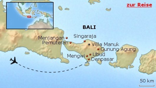 Die Anreise erfolgt über den internationalen Flughafen Ngurah Rai bei Denpasar. Von Deutschland aus bestehen keine Direktflüge, ein Umstieg ist erforderlich, etwa in Singapur, Bangkok oder Dubai. Die reine Flugzeit beträgt je nach Verbindung zwischen 14 und 18 Stunden. Der Transfer vom Flughafen zur Villa Manuk im Norden Balis dauert etwa zwei bis drei Stunden und führt durch wechselnde Landschaften von der Küste bis in die Berge. Der Transfer kann für 60 Euro pro Strecke gebucht werden und ist nicht im Reisepreis enthalten.
