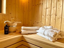 Der moderne Bungalow verfügt über eine eigene Terrasse, einen Wohnraum, teils über eine Sauna, ein Schlafzimmer und ein Badezimmer. Boxspringbetten mit hochwertiger Baumwollbettwäsche der Marke Irisette bescheren Ihnen einen tiefen Schlaf. In jedem Schlafzimmer befindet sich ein Flachbild TV, Leselampen und genügend Ablageflächen. (Beispielbilder)