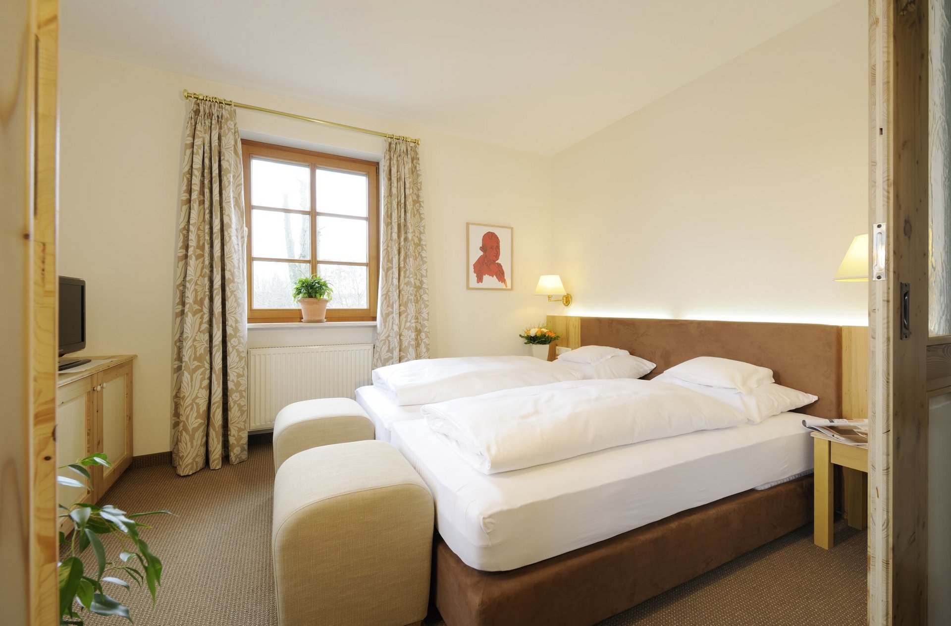 Alle Juniorsuiten verfügen über einen Balkon, eine ausziehbare Couch, einen Schreibtisch mit Internetanschluss, einen Flat Screen, eine Minibar und einen Safe. Es gibt zwei Kategorien. Die Mozart-Zimmer sind 40 qm groß und haben Boxspringbetten (200 x 180 cm), einen abtrennbaren Wohnbereich sowie neu renovierte Badezimmer mit Badewanne und separatem WC. Die Zimmer der Kategorie Nannerl sind 36 - 40 qm groß, verfügen über ein modernes Badezimmer mit Wasserfall-Dusche und WC und haben ein großes Boxspringbett (230 x 210 cm). Die Zimmer können auch zur Alleinnutzung gebucht werden. (Beispielbild)
