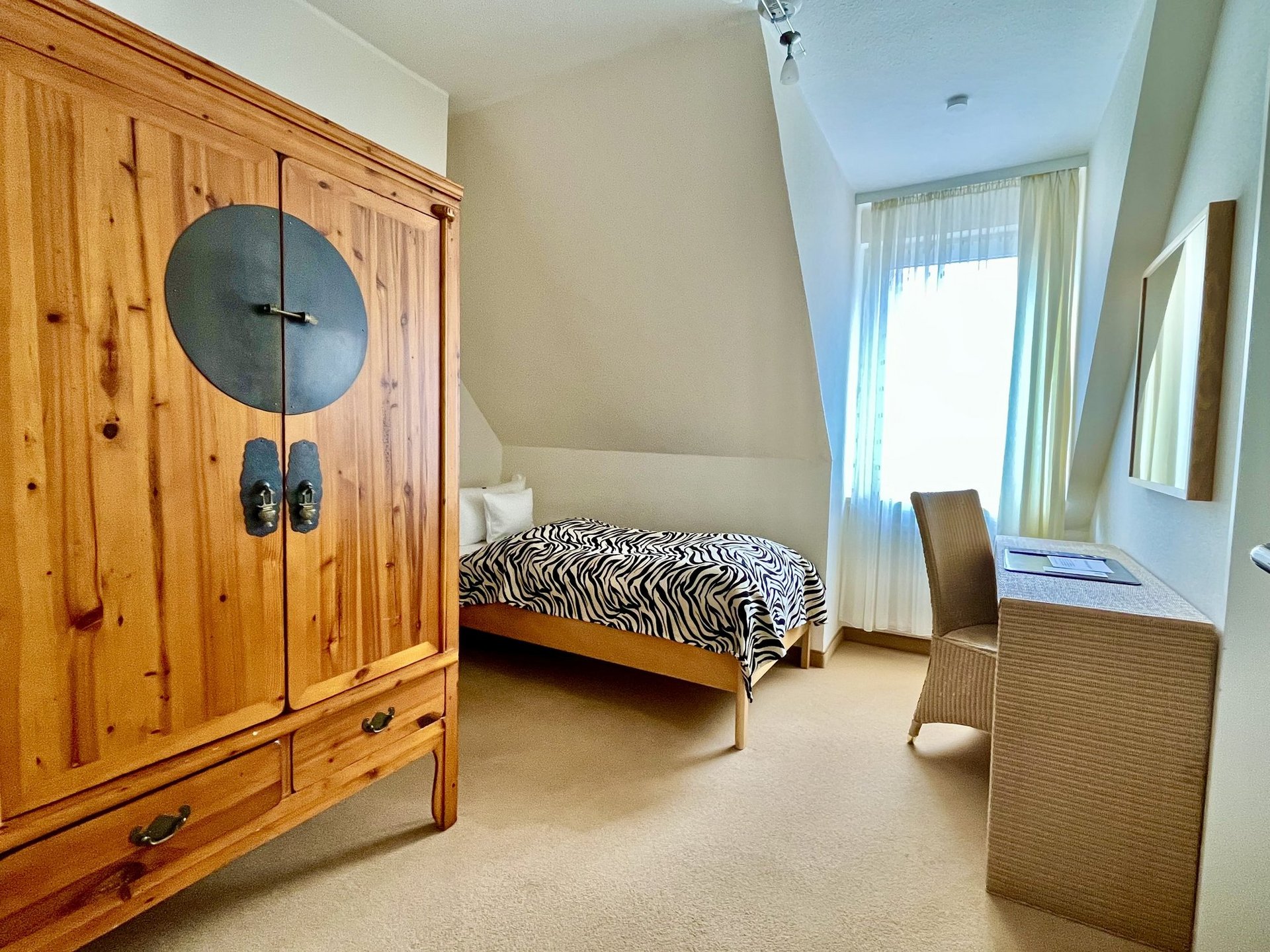 Alle Zimmer verfügen über ein eigenes Bad mit Dusche und WC sowie einen Safe. Sie sind teilweise mit Teppich- oder mit Holzfußboden ausgestattet. Auf Fernsehgeräte wird bewusst verzichtet. Das Doppelzimmer kann auch zur Alleinnutzung gebucht werden. (Beispielbild)