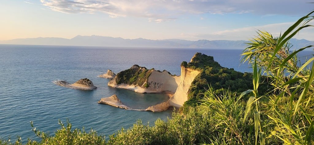 Die Bucht Agios Georgios Pagi im Nordwesten Korfus bewahrt ihre ursprüngliche Atmosphäre fernab des Massentourismus. Das glasklare Wasser und der Naturstrand schaffen eine Ruhe, die das Ankommen erleichtert. Kleine griechische Pensionen und Tavernen prägen den authentischen Charakter der Bucht. Von hier aus erreichen Sie das Kunstdorf Afionas, wandern auf alten Eselspfaden zur Engelsburg oder entdecken schattige Olivenhaine.
