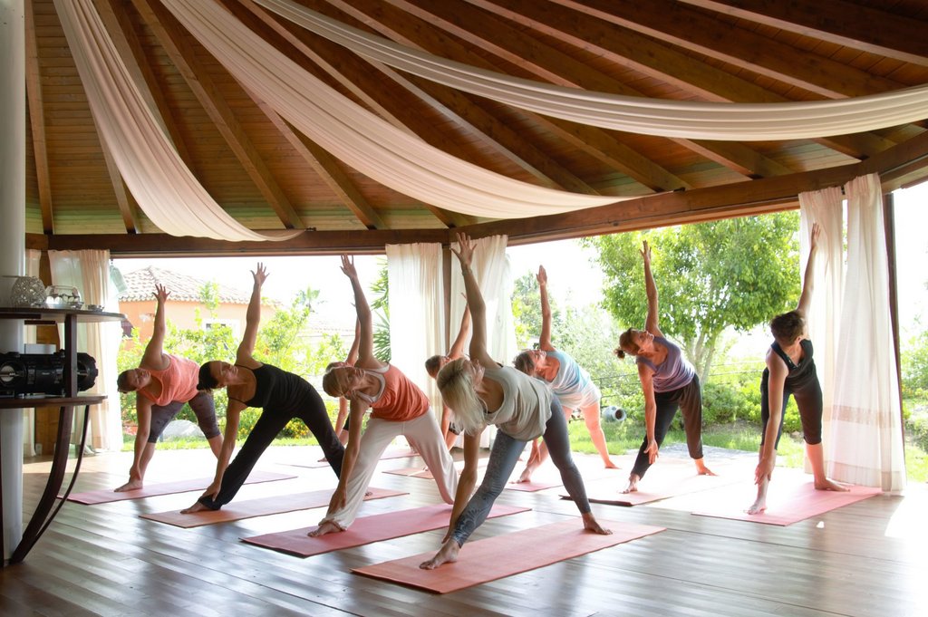 Jeden Morgen beginnt der Tag mit 90 Minuten Yoga vor dem Frühstück. Die Praxis findet je nach Gruppengröße in einer der beiden Yogahallen statt – entweder mit Blick über das Mittelmeer oder im blühenden Garten.