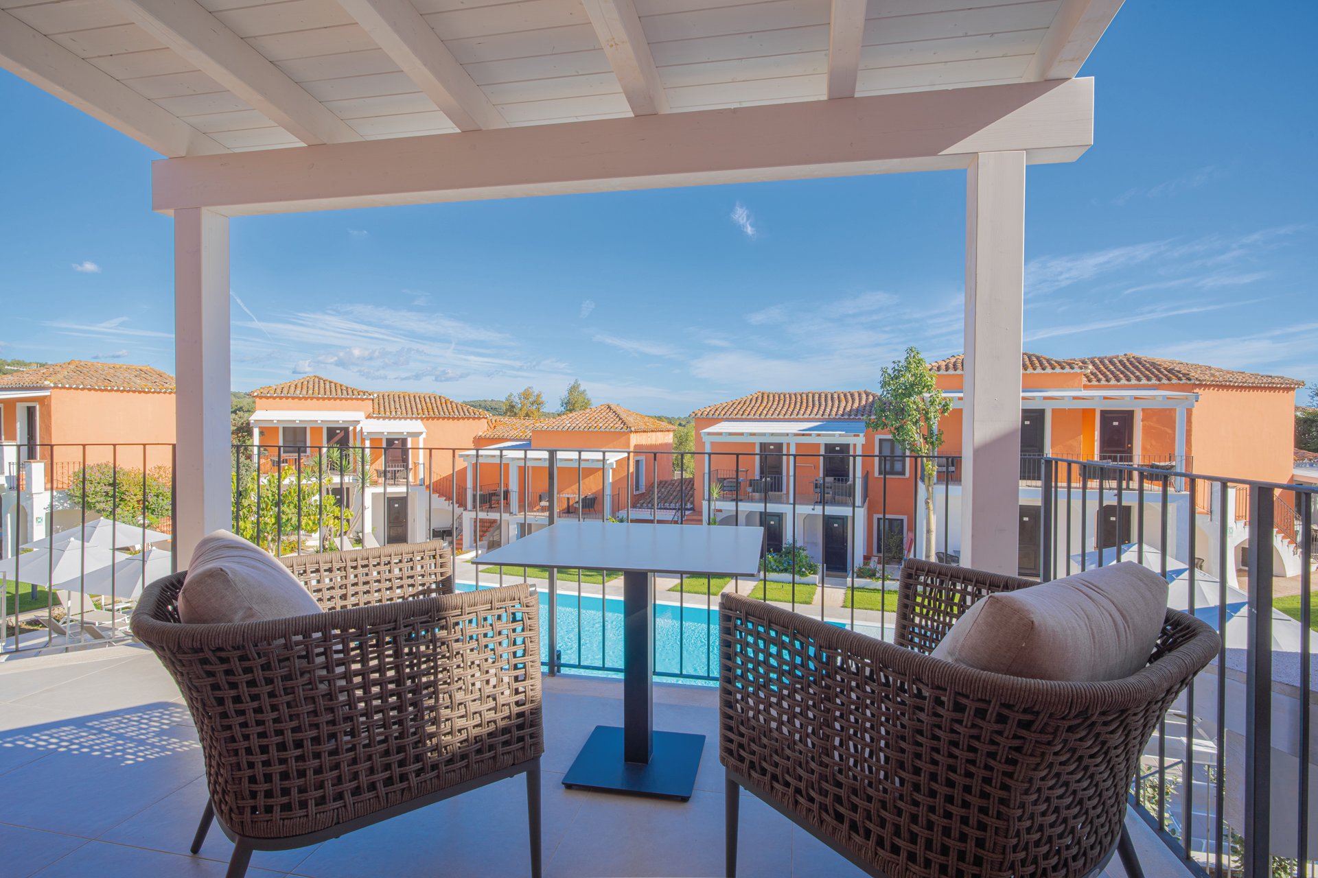 Das Hotel liegt oberhalb der Badebucht von Torre di Bari, in zehn Gehminuten erreichen Sie den weitläufigen Strand mit klarem Wasser. Die Zimmer verteilen sich auf mehrere Gebäude: Superior-Zimmer im Haupthaus (teilweise mit Meerblick), Galanias-Zimmer in Nebengebäuden im Garten, Pool- und Deluxe-Zimmer am unteren Poolbereich.