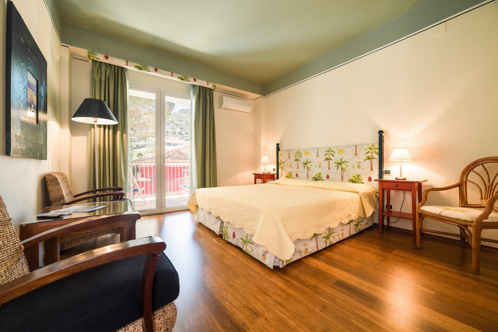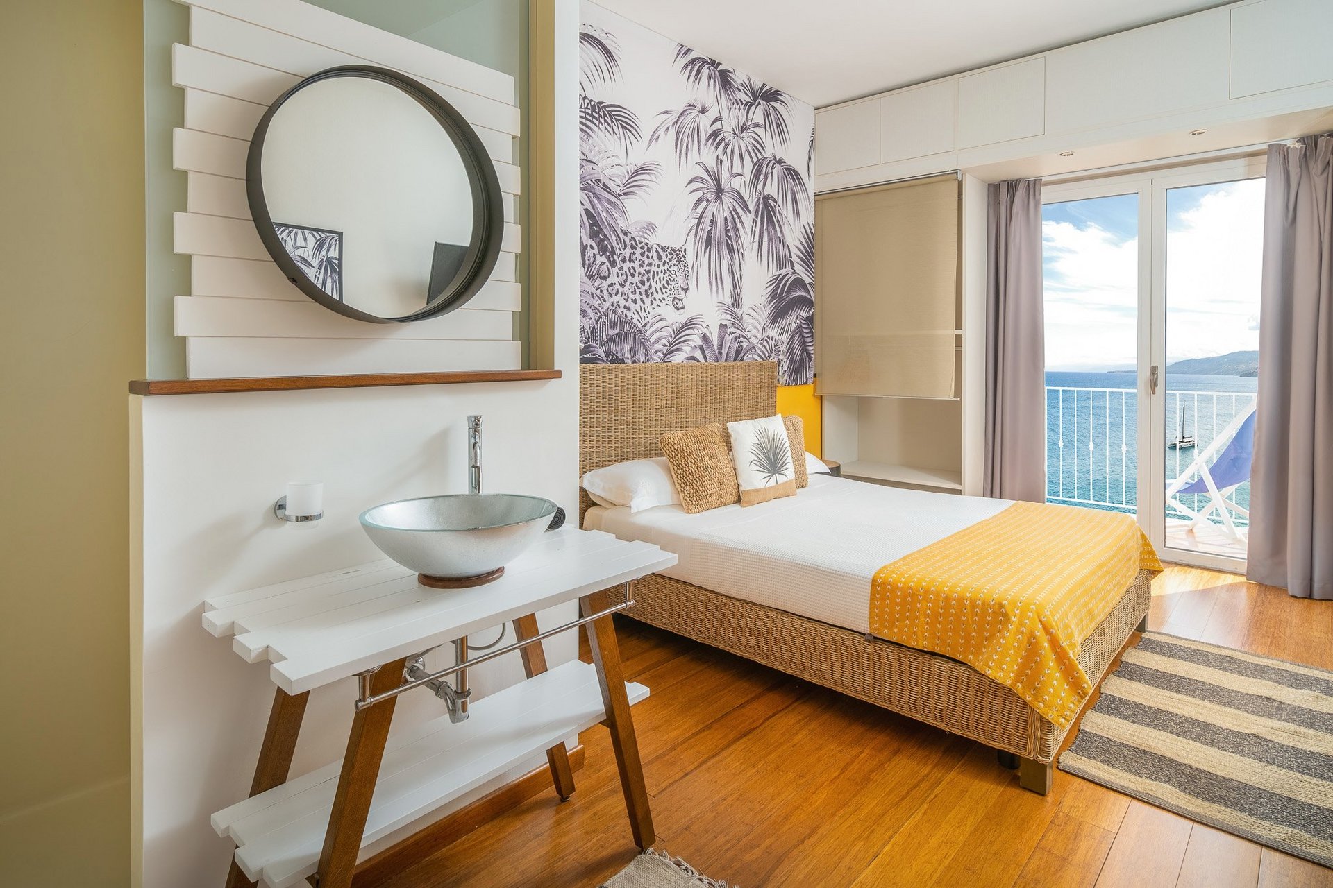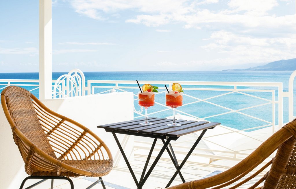 Die Doppelzimmer mit Meerblick sind ausgestattet mit Queen-Size-Betten oder zwei Einzelbetten. Sie verfügen über einen Schreibtisch und eine Sitzecke und haben einen Balkon mit Strandstühlen und Blick über die Caldura-Bucht. Die Zimmer verfügen über ein eigenes Bad mit Dusche, eine Klimaanlage/Heizung, Safe, Flat-TV, WLAN, Minibar, Haartrockner, Slipper und Handtücher. Das Doppelzimmer kann auch zur Alleinnutzung gebucht werden. (Beispielbild)