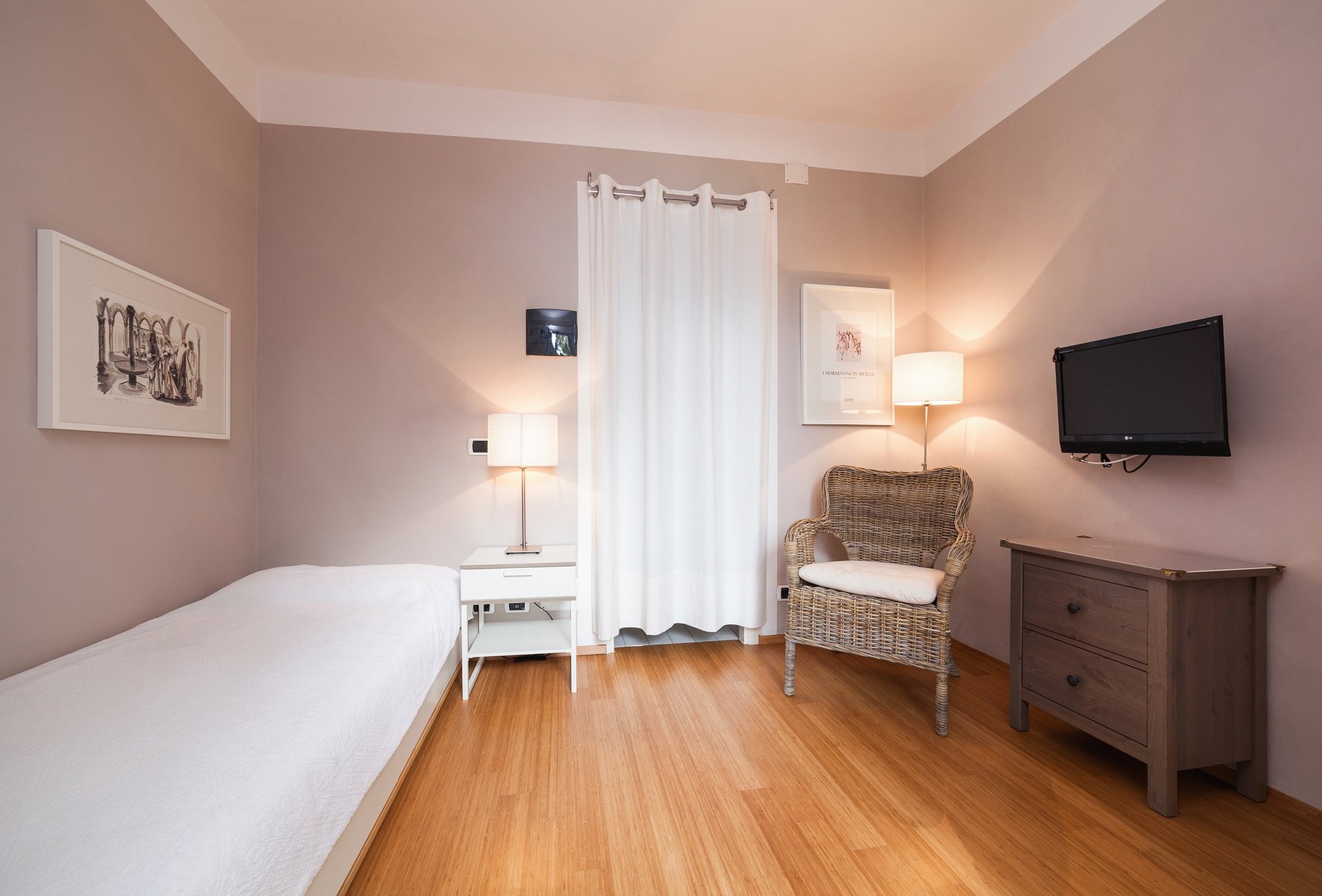 Die Einzelzimmer sind etwa 12-13 qm groß und verfügen über 1,20 m große Betten. Sie haben entweder einen kleinen Balkon mit Blick auf die gegenüberliegende Hauswand sowie seitlich zum Meer oder eine ebenerdige Terrasse mit Blick auf den Garten. Die Zimmer verfügen über ein eigenes Bad mit Dusche, eine Klimaanlage/Heizung, Safe, Flat-TV, WLAN, Minibar, Haartrockner, Slipper und Handtücher. (Beispielbild)