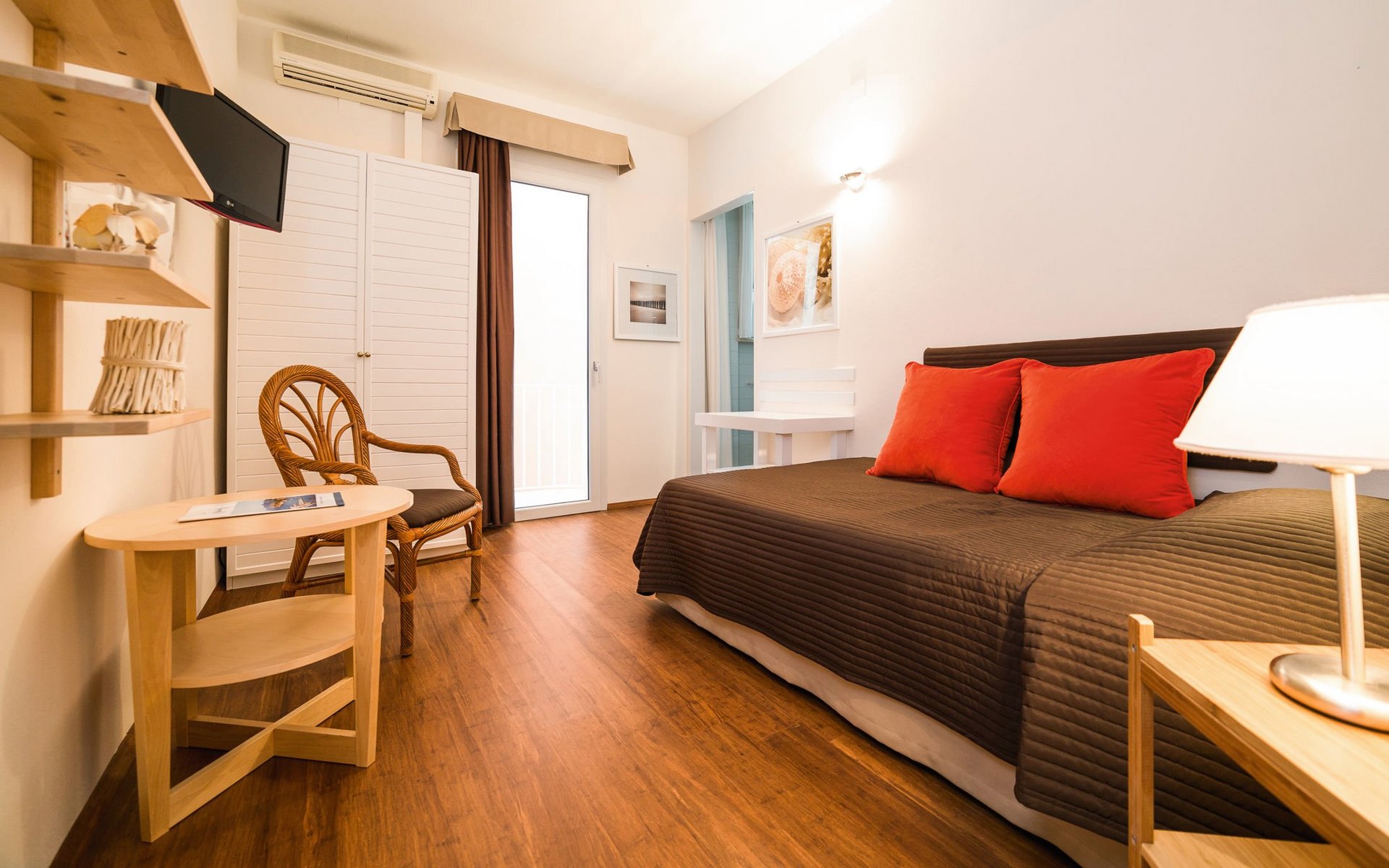 Die Doppelzimmer ohne Meerblick sind etwa 22-24 qm groß und verfügen über 1,60 m große Betten. Sie zeigen zum Hausberg, seitlich zum Meer oder auf eine Grünanlage und haben einen Balkon oder eine Terrasse. Die Zimmer verfügen über ein eigenes Bad mit Dusche, eine Klimaanlage/Heizung, Safe, Flat-TV, WLAN, Minibar, Haartrockner, Slipper und Handtücher. Das Doppelzimmer kann auch zur Alleinnutzung gebucht werden. (Beispielbild)
