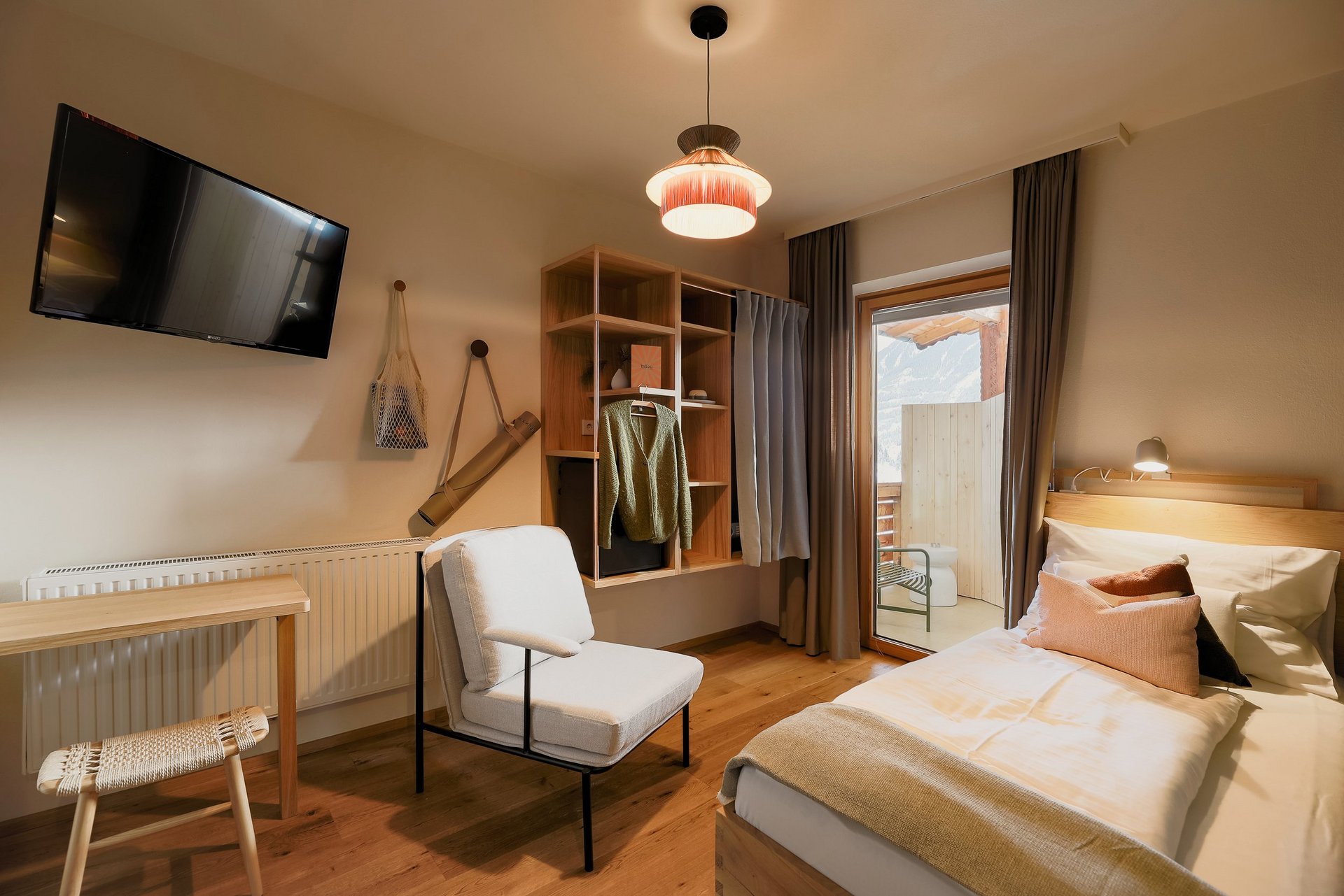 Im Hotel stehen Ihnen insgesamt 19 stilvolle und zum Teil frisch renovierte Zimmer zur Verfügung. Die Zimmer sind mit natürlichen Materialien aus der Region ausgestattet. Vor allem die vielen liebevollen kleinen Details werden Ihren Urlaub zu etwas Besonderem machen. Die naturbelassenen Ahornmöbel und der Holzfußboden verbreiten zusätzliche Gemütlichkeit. Die Doppelzimmer, sowie zwei Einzelzimmer verfügen über einen Balkon, auf dem Sie abends die Ausblicke auf das umwerfende Panorama genießen können. Das dritte Einzelzimmer verfügt über einen Zugang zu der Yogaplattform, welche Sie für sich außerhalb der Yogazeiten nutzen können. Mit einem schlichten Design und Blick auf die umliegenden Berge sowie in den Sternenhimmel überzeugen die neuen Eco Cabins, welche sich im Garten befinden. Für einen besonders erholsamen Schlaf sorgt die Ihnen zur Verfügung stehende Kissenauswahl.