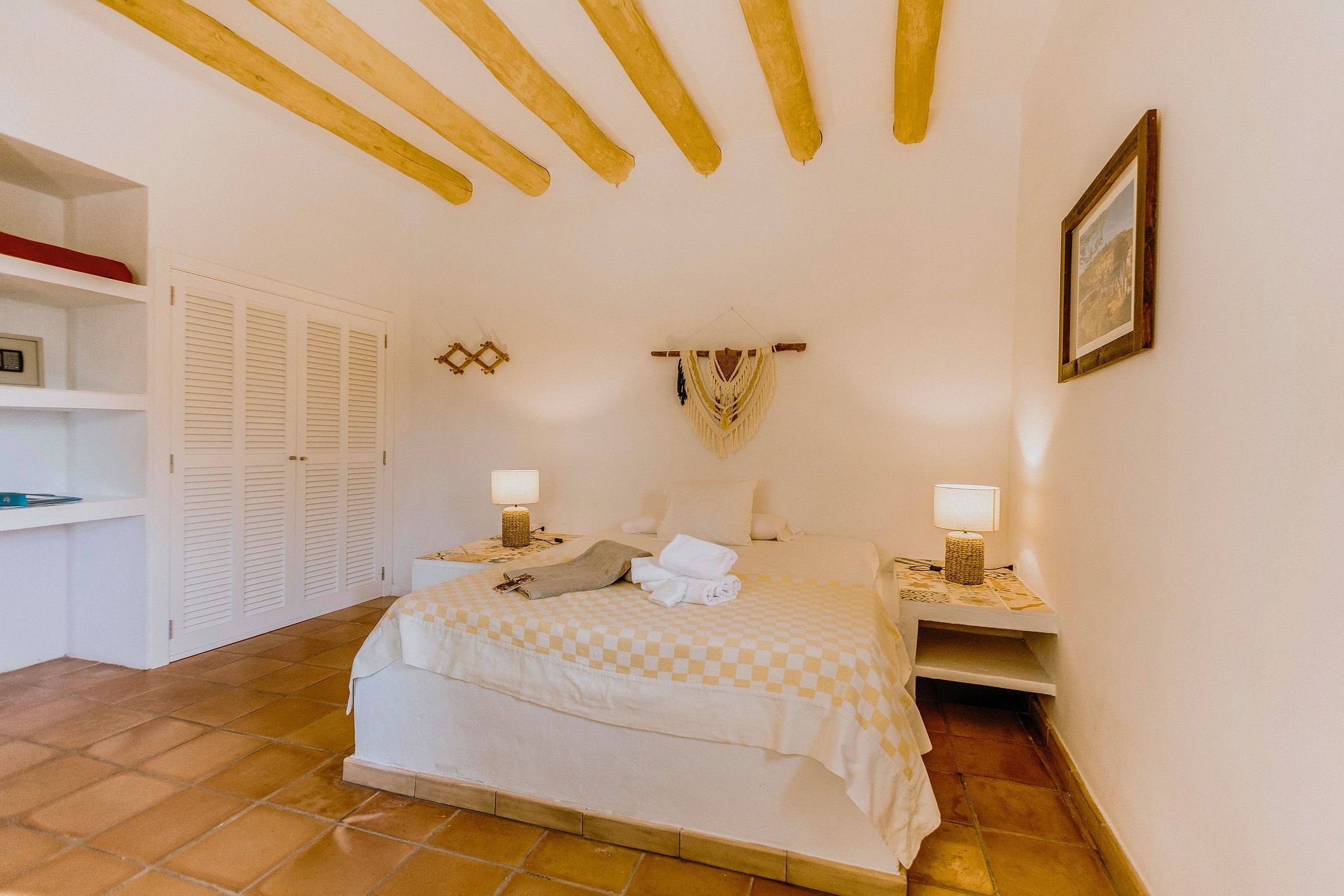 Es gibt zwei Appartements im Haupthaus, welche über zwei Einzelzimmer und ein gemeinsames Bad mit Föhn verfügen. Shampoo und Duschgel sind vorhanden. Das Appartement „Formentera“ verfügt über eine große überdachte Terrasse und das „Ibiza“ über einen Balkon mit Weitblick. Diese Zimmer sind etwas kleiner und nach vorne zum Eingang ausgerichtet. Die Betten sind 1,60m breit. Zu den Annehmlichkeiten gehören Safe, Wasserkocher, Thermoskanne und Teebeutel, ebenso wie eine Pool-Tasche mit Bademantel und Pool-Handtuch. (Beispielbilder)